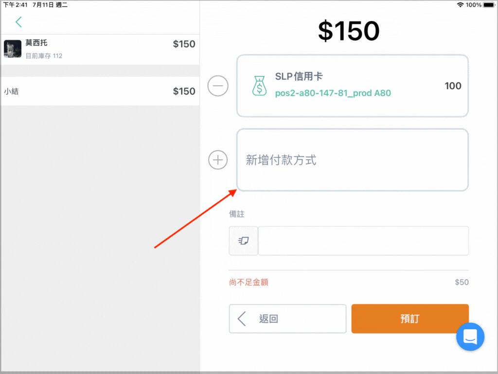 選擇第一種付款方式後,編輯付款金額,使其小於總訂單金額。