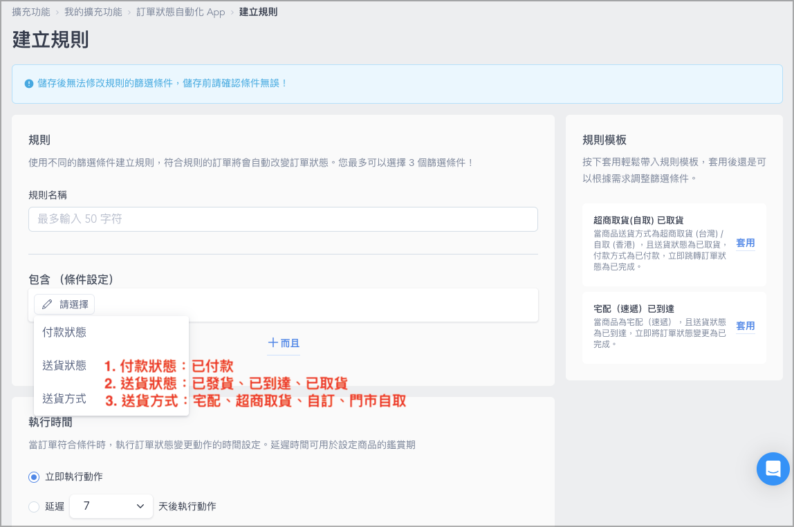 情境 2 - 非串接物流:您可以將條件設定為「付款狀態 > 已付款 + 送貨狀態 > 已取貨 + 送貨方式 > 門市自取」時,訂單狀態自動更改為已完成。