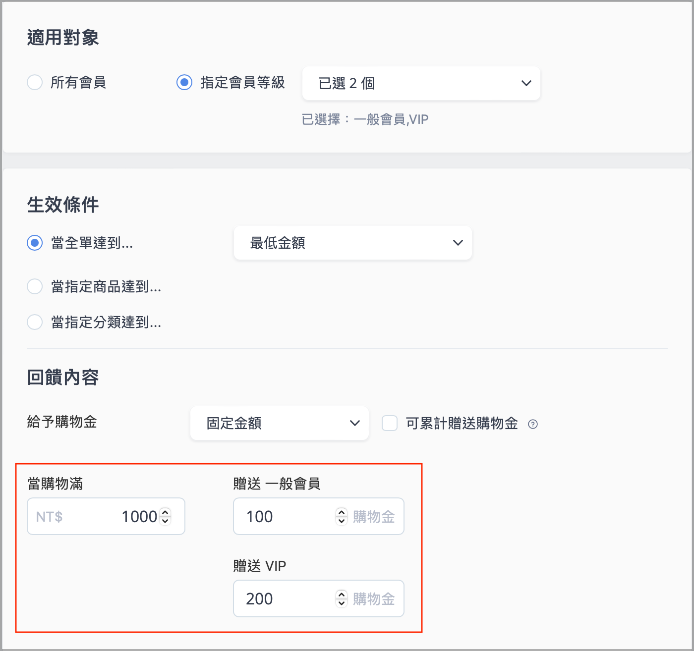 回饋活動可以設定適用所有會員或指定會員等級,並設定不同等級的回饋購物金,吸引顧客回購或升級會員 🥰